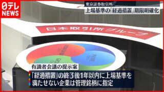 暗号 【東京証券取引所】上場企業「経過措置」期限明確化の案を提示 東京証券取引所は、去年4月の市場の再編で、上場の基準を満たしていない企業に対し、「当分の間」の経過措置を設けました。その経過措置について、終了時期を明確に区切る案が示されました。東京証券取引所は、去年4月に市場をプライム、スタンダード、グロ... 2025.10.02 暗号